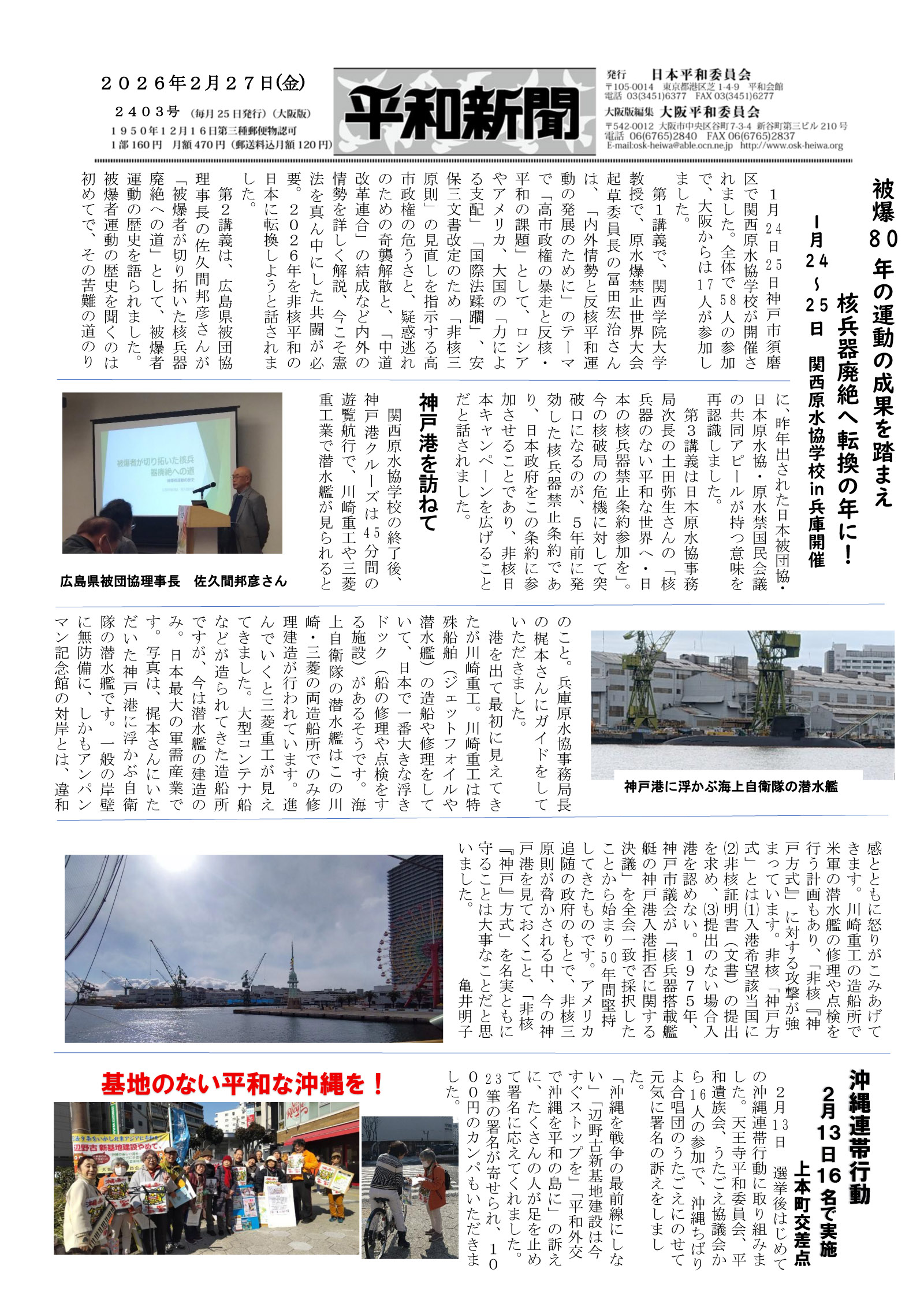 今こそ、平和の出番。旺盛な運動を進めるためには、力強い平和の仲間が必要です。「一歩前進二歩後退」の現状から1日も早く脱し、反転攻勢の年にしようではありませんか。