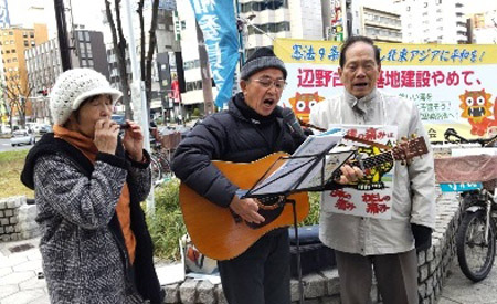 うたごえ協議会の立川さん、平和遺族会の大島さん、大阪平和委員会の亀井さんが訴えました。