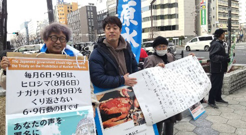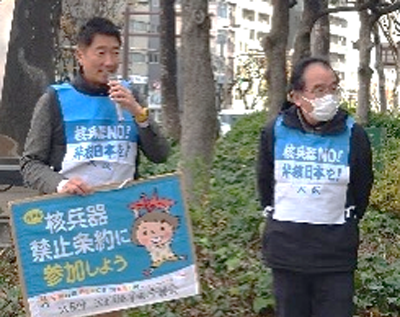 この行動は、三宅良夫大阪憲法会議事務局長の司会ですすめられ、橋口大阪原水協事務局長、上羽治雄大阪平和委員会事務局長、清水正日本共産党前衆議院議員の3人がマイクを通して「ヒロシマ・ナガサキをくりかえさないために、日本政府は核兵器禁止条約に署名、批准を」と訴えました。