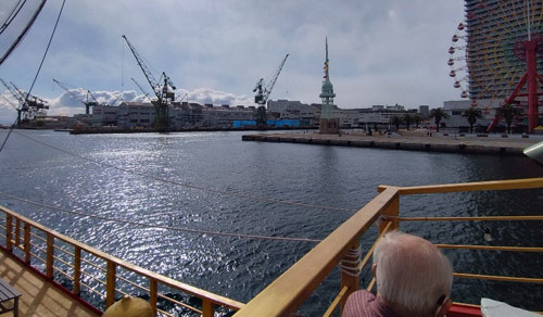 関西原水協学校の終了後、神戸港クルーズは45分間の遊覧航行で、川崎重工や三菱重工業で潜水艦が見られるとのこと。兵庫原水協事務局長の梶本さんにガイドをしていただきました。