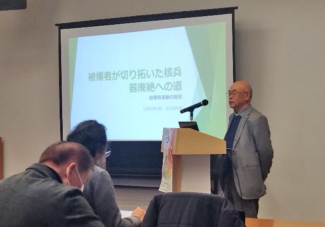 第2講義は、広島県被団協理事長の佐久間邦彦さんが「被爆者が切り拓いた核兵器廃絶への道」として、被爆者運動の歴史を語られました。被爆者運動の歴史を聞くのは初めてで、その苦難の道のりに、昨年出された日本被団協・日本原水協・原水禁国民会議の共同アピールが持つ意味を再認識しました。