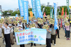 「 ……戦争国家の法的基盤が「戦争法案」、物的基盤が沖縄基地・辺野古新基地建設という関係にあります。ただちに広範な人々にこの危険な関係について創意工夫を凝らし知らせていけば、国民の反対世論を圧倒的に広げていくことは可能です。大阪平和委員会と基礎組織は、この夏、全力で反対世論を高める活動に足を踏み出し、「戦争法案」廃案と辺野古新基地建設阻止に追い込む決意です」