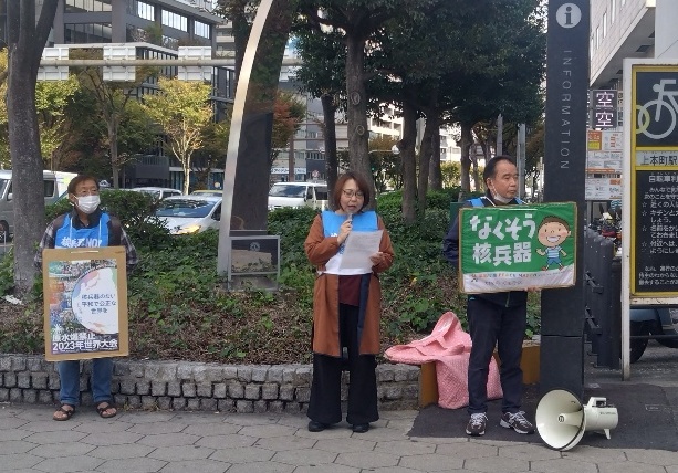 「岸田内閣は安保3文書で日本を戦争する国にかえようとしている。そのため防衛費を昨年の5.4兆円から一気に10兆円超へ倍増しようとしている。岸田政権の戦争準備に反対し、憲法と非核平和を守りぬきましょう」。